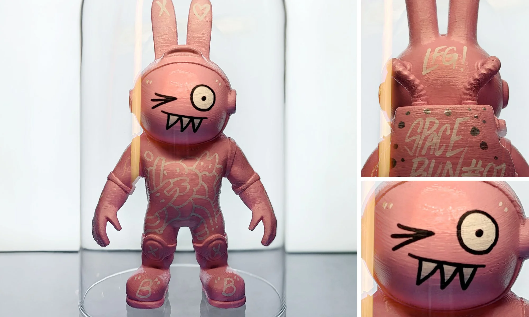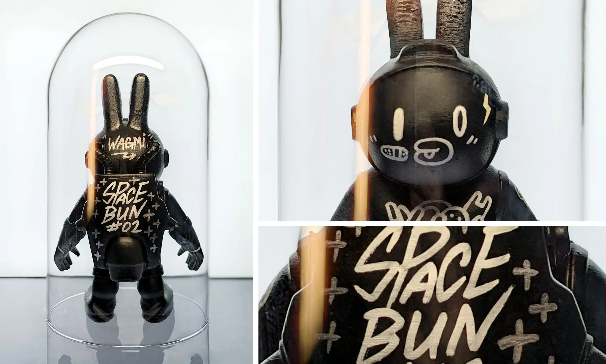 Black Pink Space Buns Standing 8 inches tall and 4 inches wide, each of these 3D-printed vinyl figures is hand-painted and completely one-of-a-kind. Displayed in a 10-inch-tall glass case.