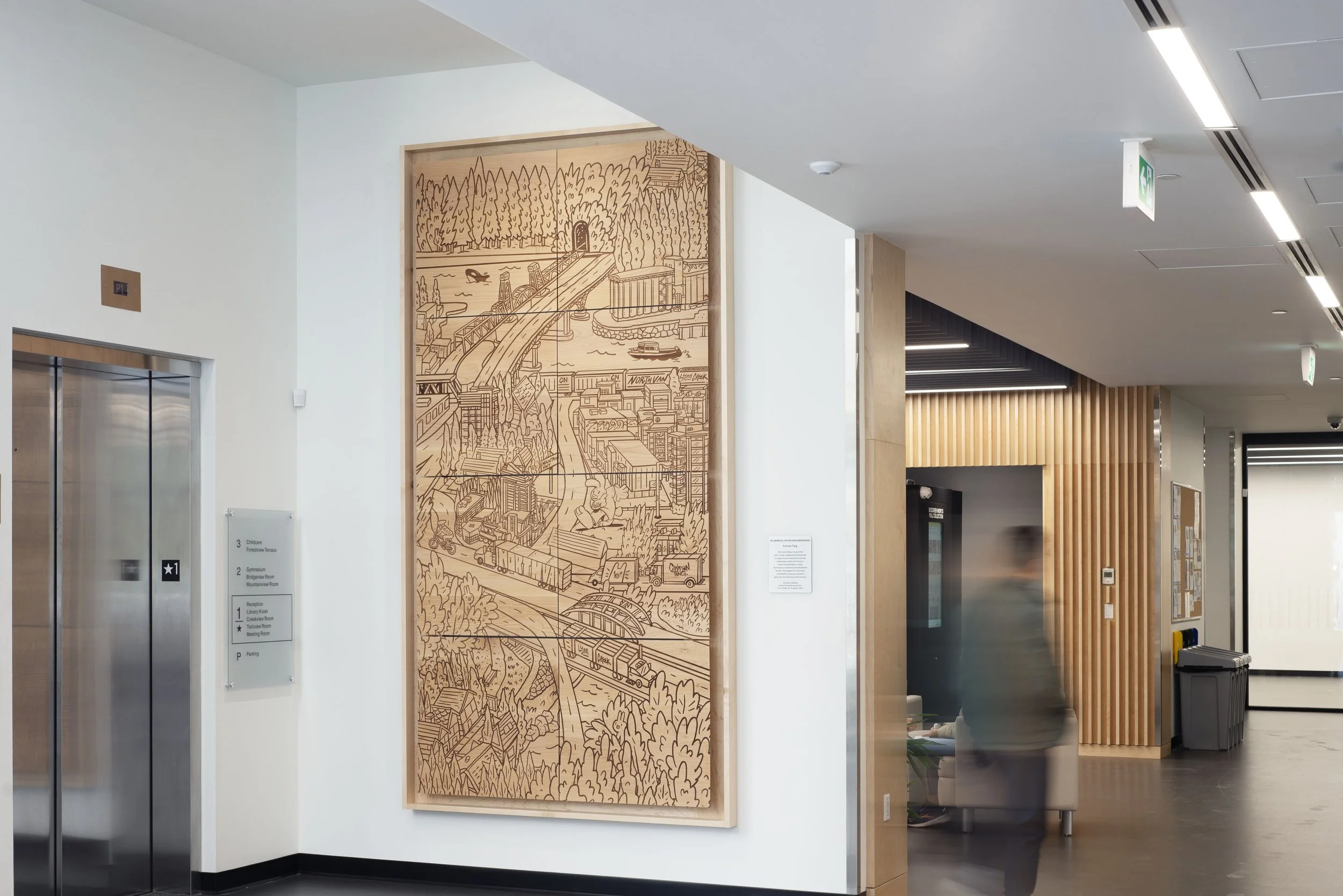 Installed and fabricated by Bram from Willow + Stump from East Vancouver. Each of the 8 panels takes 6 hours to laser engrave to make up this 5’ wide by 10’ tall wooden map mural. And finally a floating frame secures the entire piece giving it a strong presence while protecting the art.